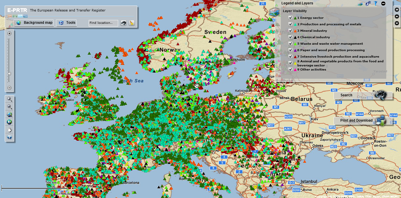 Online maps published by the European Pollutant Release and Transfer Register (E-PRTR), allow users to pinpoint the key environmental data and the main sources of air pollution from industrial facilities across Europe. The European Pollutant Release and Transfer Register (E-PRTR) is the a Europe-wide register that provides easily accessible key environmental data from industrial facilities in European Union Member States and in Iceland, Liechtenstein, Norway, Serbia and Switzerland. It replaces and improves upon the previous European Pollutant Emission Register (EPER). The register contains data reported annually by some 28,000 industrial facilities covering 65 economic activities across Europe. The interactive map shows where certain pollutants are released from individual industrial plants. . The Europe-wide register aims to help Europeans actively engage in decisions affecting the environment. The map search option provides a geographical approach to the E-PRTR data. The map can even be viewed here in maximized version.